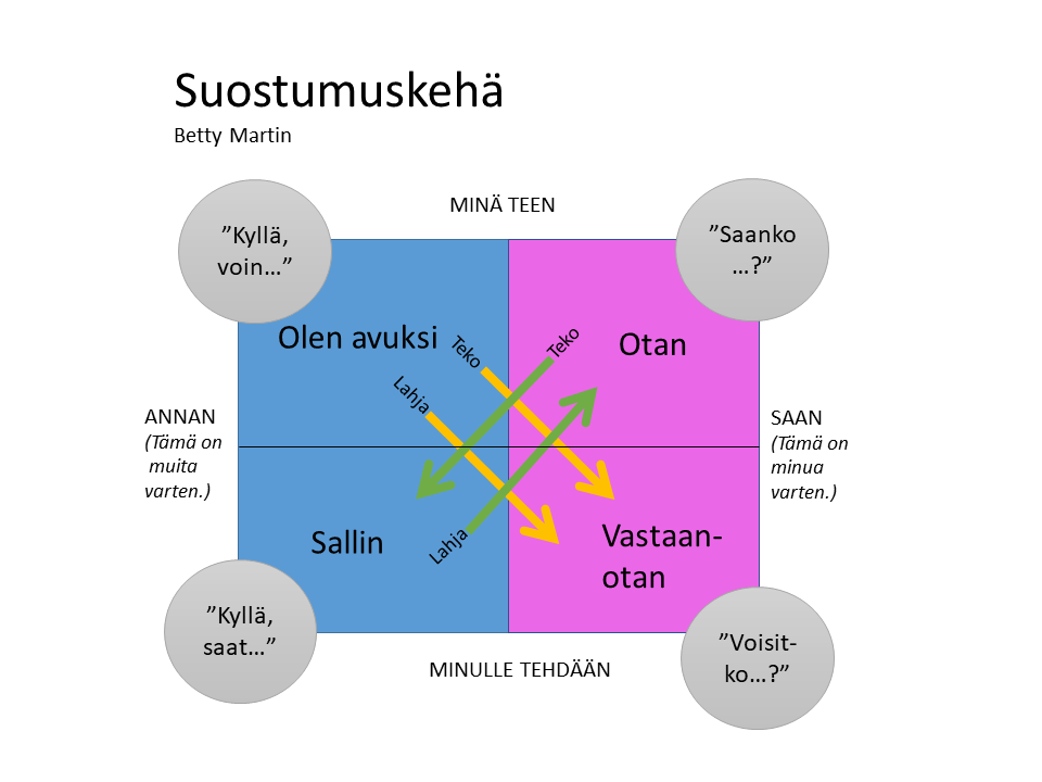 Kirjassa pohditaan myös erilaisten kysymismuotojen vivahde-eroja suostumuksen kannalta. Nikulainen huomauttaa, että on eri asia kysyä ”Saanko suudella sinua?” kuin ”Haluatko suudella minua?”. Ensimmäisessä kysytään lupaa tehdä jotakin toiselle − vain jälkimmäisessä itse asiassa kysytään toisen halusta. Tästä tulee mieleen Betty Martinin lanseeraama suostumuskehä, jonka olen vapaasti suomentanut alla olevaan kuvaan. Suostumuskehän nelikenttä jakautuu pystysuunnassa jonkin antamiseen muille ja jonkin saamiseen itse. Vaakaviivalla on jaettuna aktiiviset eli itse tehdyt teot ja passiiviset eli teot jotka sallin tehtävän itselleni. Suostumustilanteita tai -rooleja on näin jakaen siis neljää eri lajia. Ilman harmaissa ympyröissä olevia repliikkipareja eli neuvoteltua yhteisymmärrystä tilanne ei voi olla suostumuksellinen.